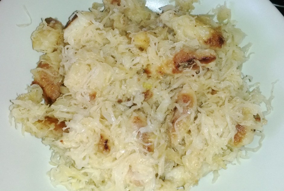 Ich habe das an dieser Stelle mal weggelassen und stattdessen einfach das Sauerkraut hinzu gegeben und das ganze noch eine Weile in der Pfanne geschwenkt.